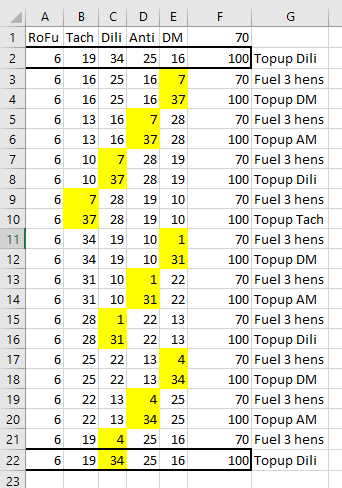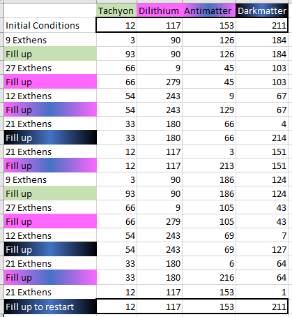 - 7T Rocket Fuel, 12T Tachyon, 117T Dilithium, 153T Antimatter, 211T Dark Matter, which then cycles as follows